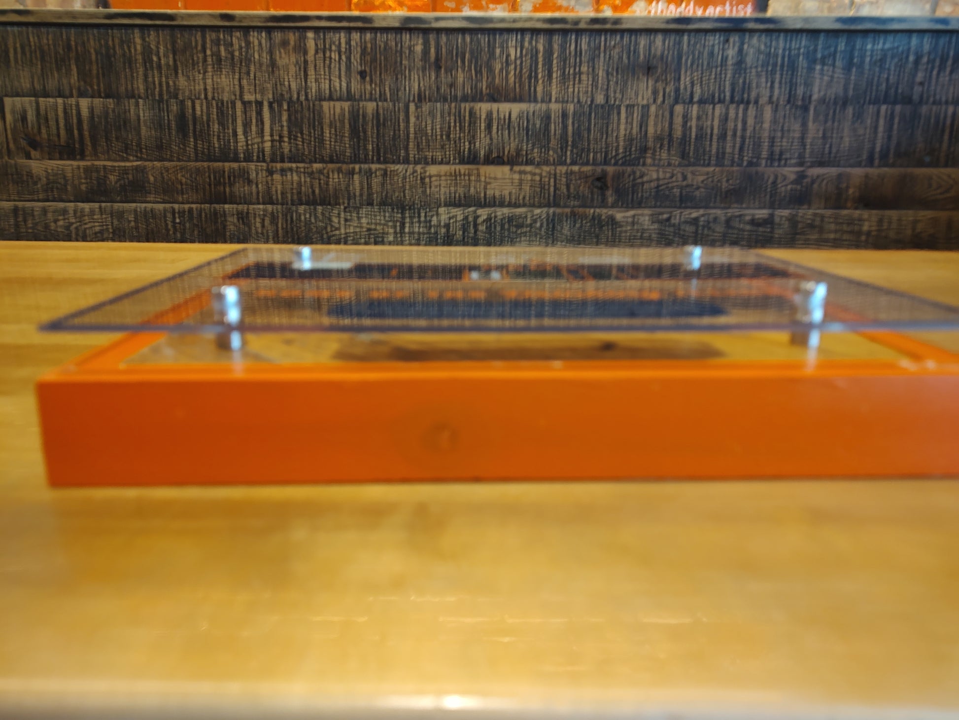 Each piece of the bar wall was cut to 10"x14" and is trimmed in orange and accented with an acrylic glass overlay which features the drawing of the Daniel street building. The acrylic glass is mounted with standoffs to accent the wood. The finished piece is approx. 3" thick.